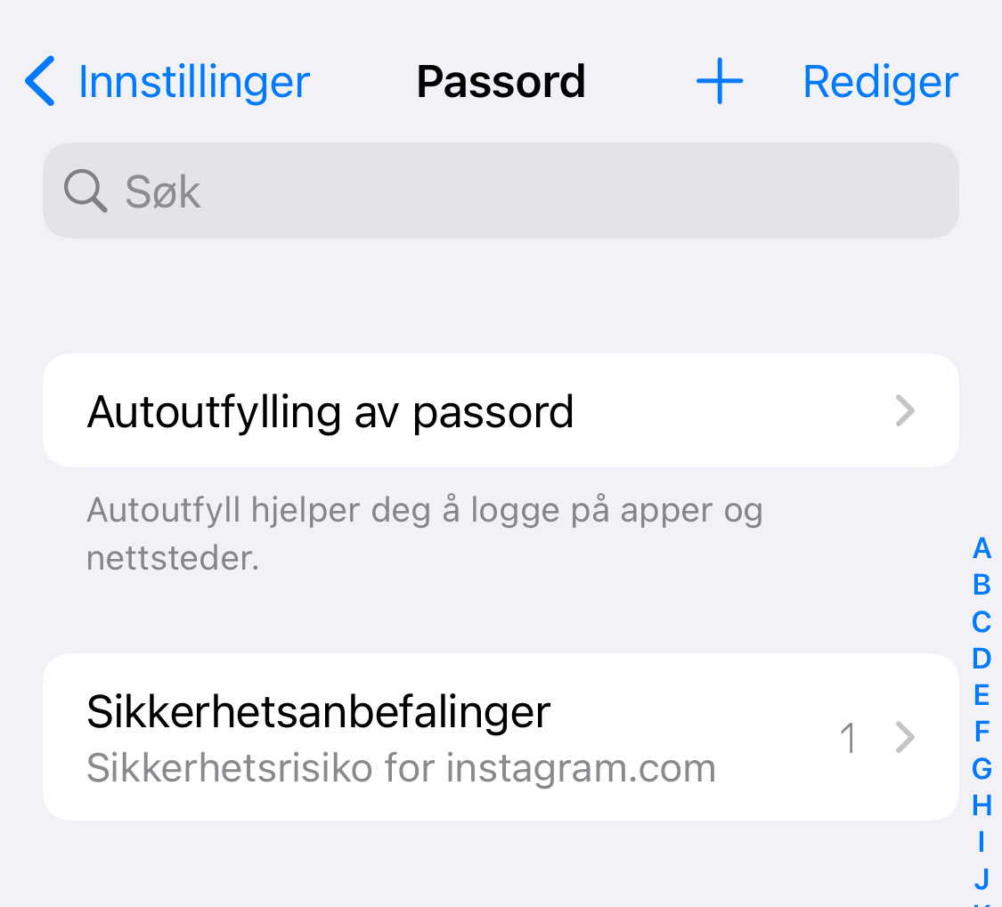 Bilde: Skjermdump fra iPhone, hvor du kan sjekke passordene dine