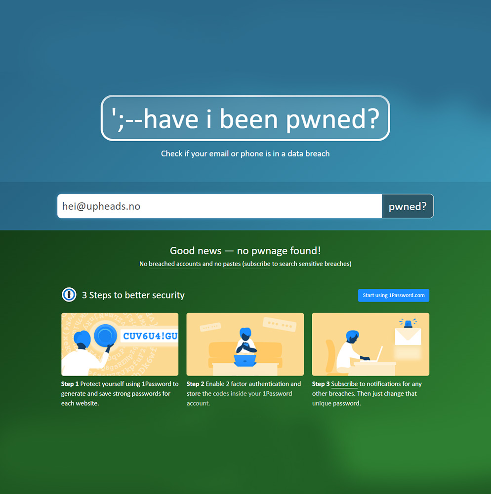 Dette er selvfølgelig et viktig spørsmål. En av de enkleste måtene å sjekke cybersikkerheten din og om passordet ditt er lekket, er via nettsiden Have I Been Pwned. Her kan du skrive inn e-posten din, så vil siden søke gjennom sin database over lekkede kontoer (som består av nesten 12 milliarder e-poster). Have I Been Pwned er en trygg side og lagrer ikke data annet enn analyse av sidehastighet og nettsideytelse.
