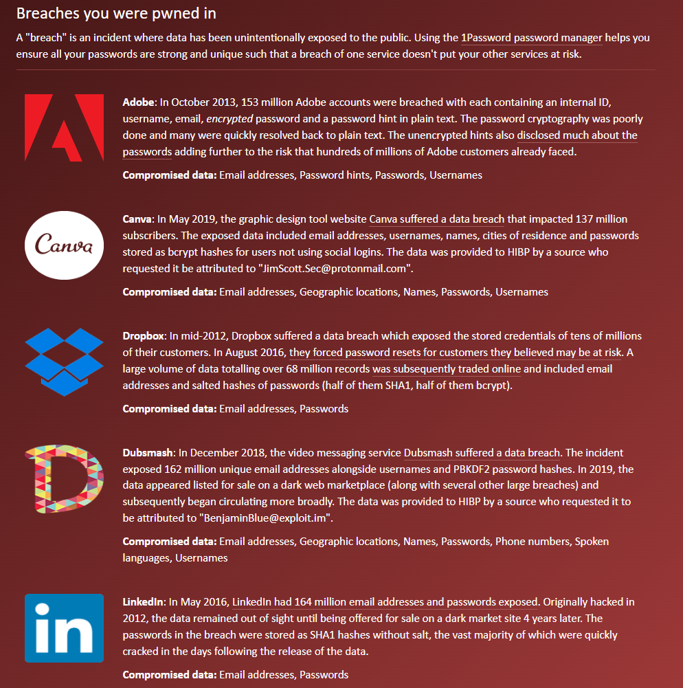 Dersom e-posten din er forbundet med en datalekkasje vil det se slik ut: