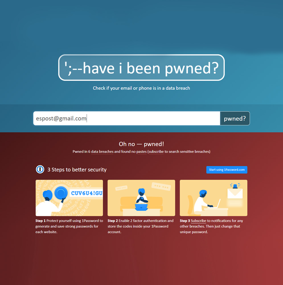 Dette er selvfølgelig et viktig spørsmål. En av de enkleste måtene å sjekke cybersikkerheten din og om passordet ditt er lekket, er via nettsiden Have I Been Pwned. Her kan du skrive inn e-posten din, så vil siden søke gjennom sin database over lekkede kontoer (som består av nesten 12 milliarder e-poster). Have I Been Pwned er en trygg side og lagrer ikke data annet enn analyse av sidehastighet og nettsideytelse.
