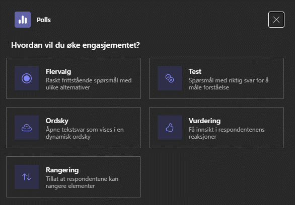 Les mer om hvordan du kan bruke Polls i Microsoft Teams.