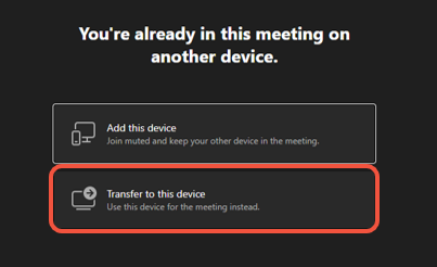 3. Nå får du valget mellom å legge til den nye enheten, altså å være i møtet med to enheter, eller overføre til den nye enheten. Velg da sistnevnte og møtet vil automatisk bli avsluttet på den første enheten: